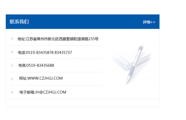 地址:常州市新北區友邦商務大廈1幢16、17層  電話:0519-85101652  傳真:0519-85112595  郵編:213022  網址:www.cz-jiayue_cn.clzqly.com  郵箱:xiajifengaa@163.com